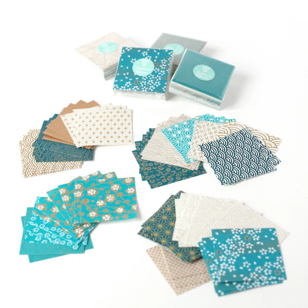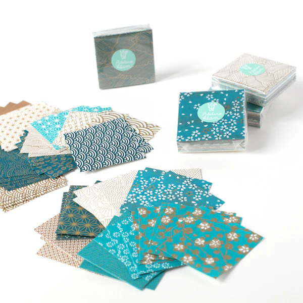 Ce joli set contient 100 carrés de papiers japonais washi, yuzen, chiyogami pour l’origami de 6cm de côté dans les tons dorés et bleu canard, de la gamme « Les Chics », sélectionnés par Adeline !