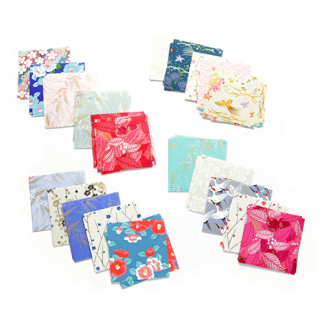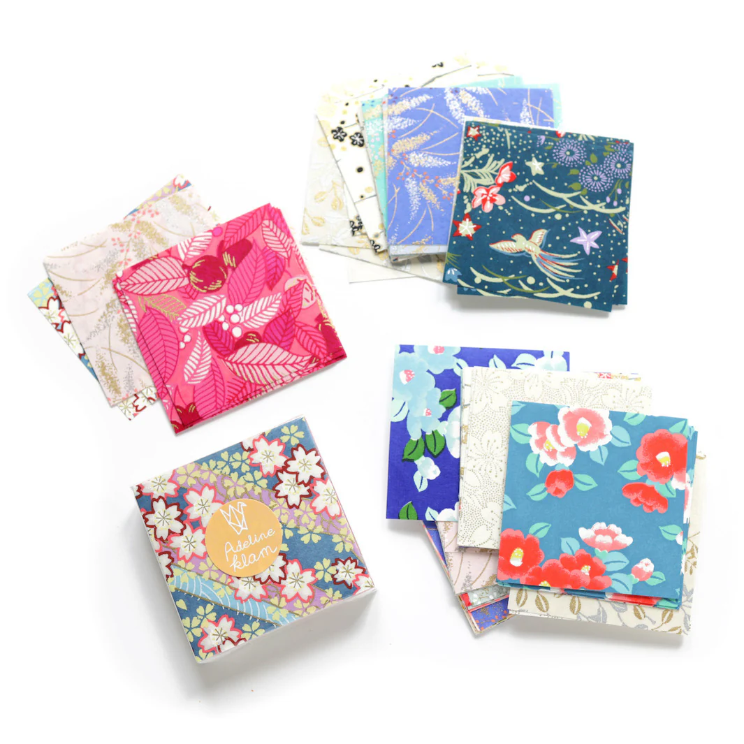 Ce petit lot contient 100 carrés de papiers japonais (washi, yuzen, chiyogami) pour l’origami de 6cm de côté, dans des tons multicolores plutôt froids, sélectionnés par Adeline !