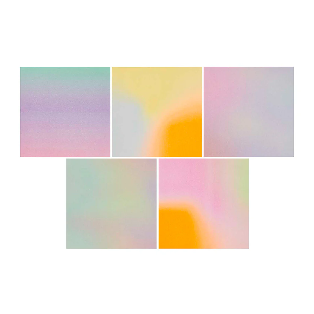 - Caractéristiques : dégradés aléatoires flous dans les tons roses, violets, verts, jaunes et orange / dégradé identique sur le recto et le verso du papier / 5 dégradés différents soit 20 papiers de chaque