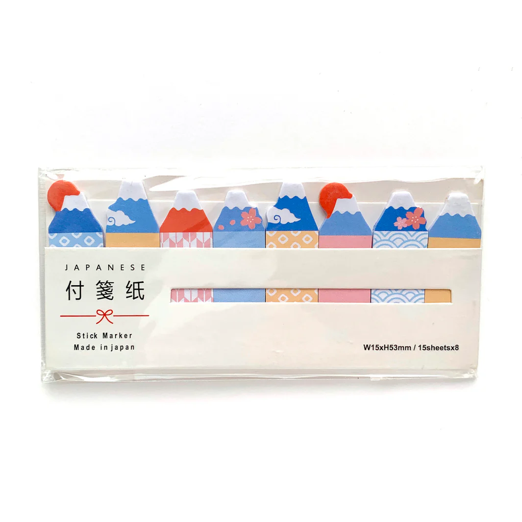 Ce lot contient 120 adorables marque-pages autocollants en forme de mont Fuji aux motifs (kanoko, seigaiha …) et couleurs (bleu, orange, rose, jaune …) variés.