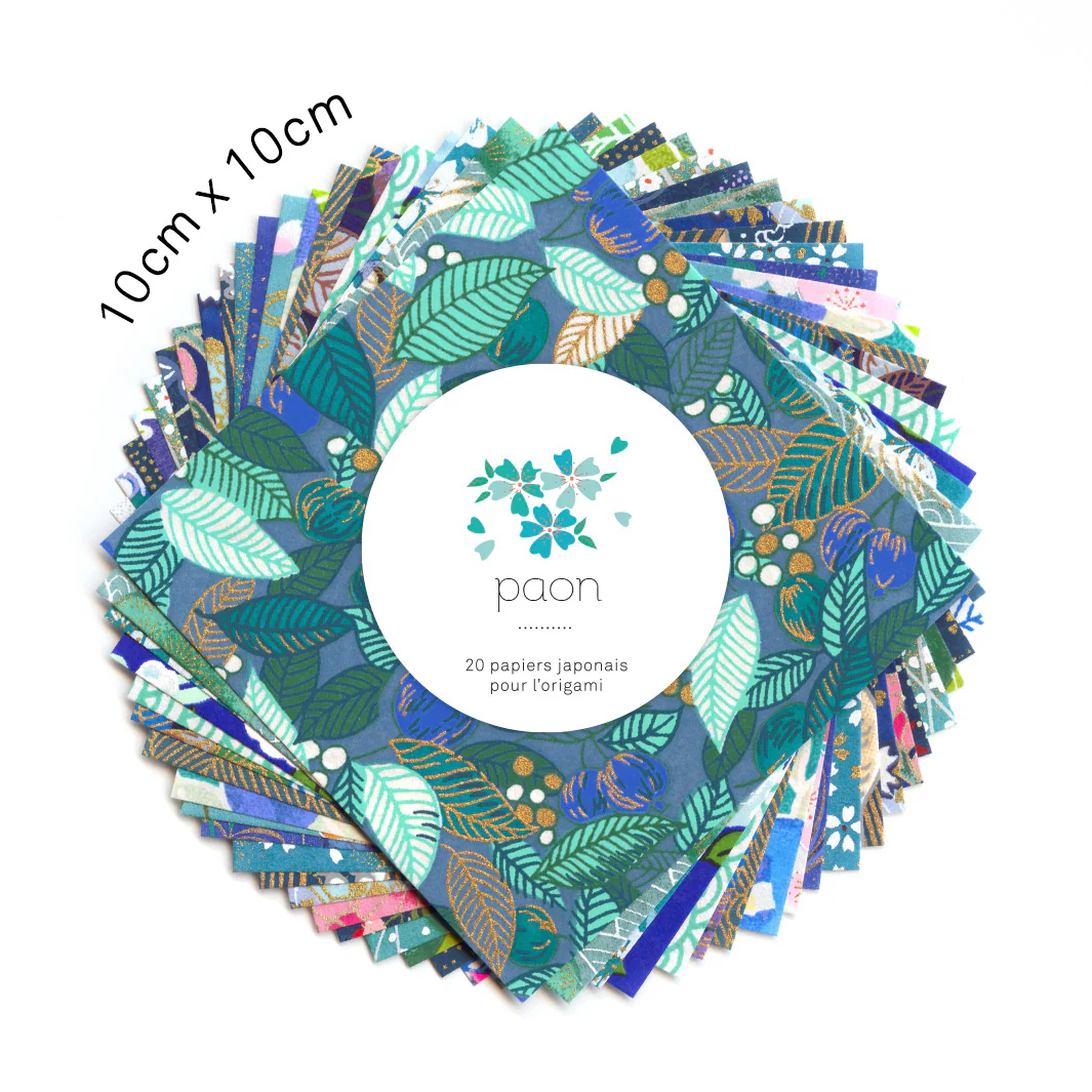 20 Papiers Origami – 10 x 10 cm – Bleu Canard, Vert d’Eau, Bleu Nuit, Turquoise et Violet – Paon