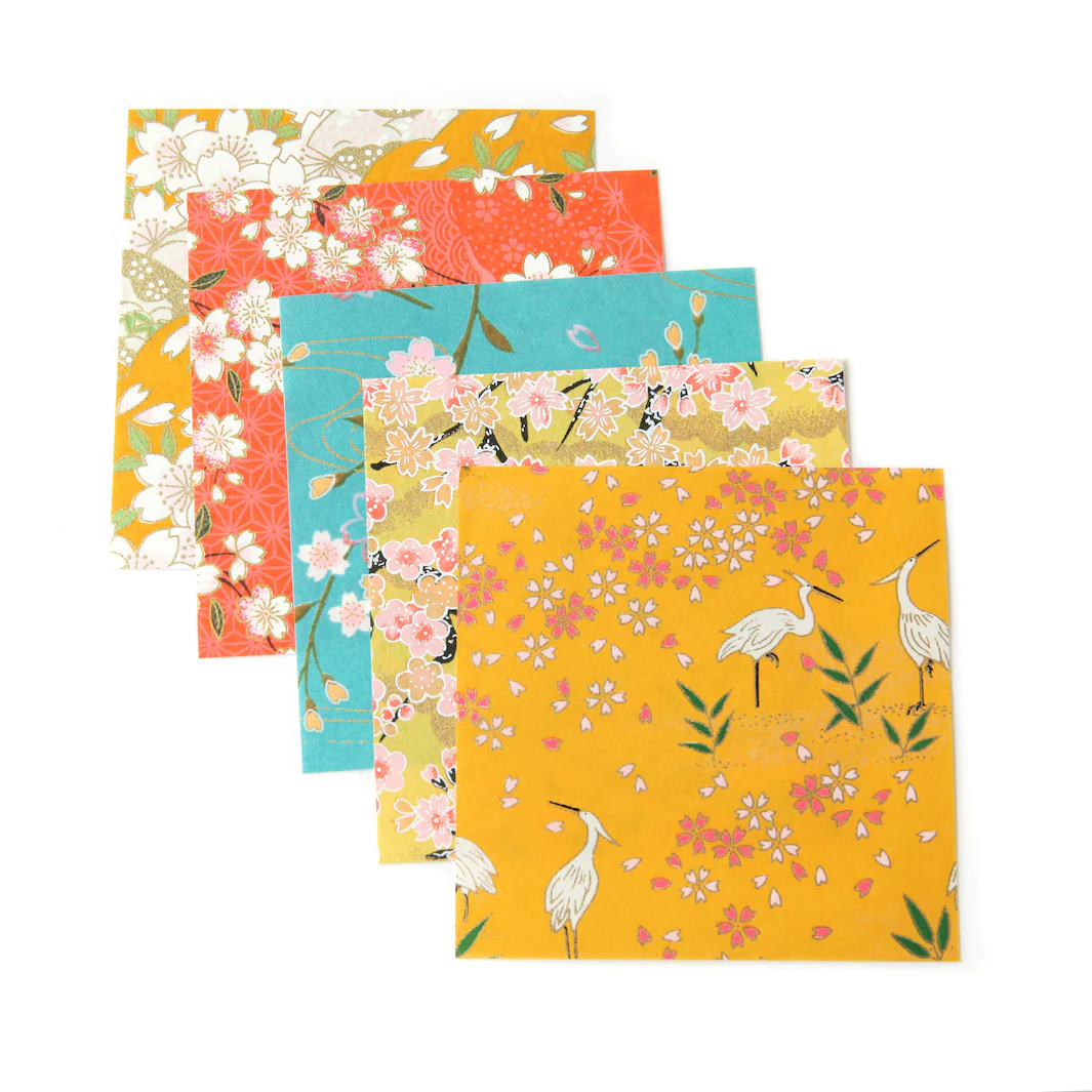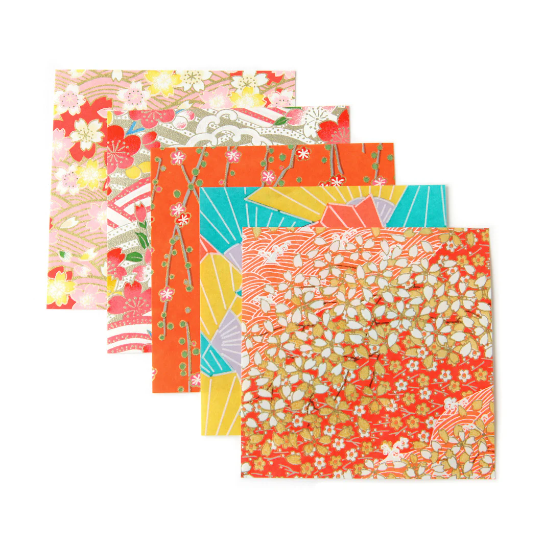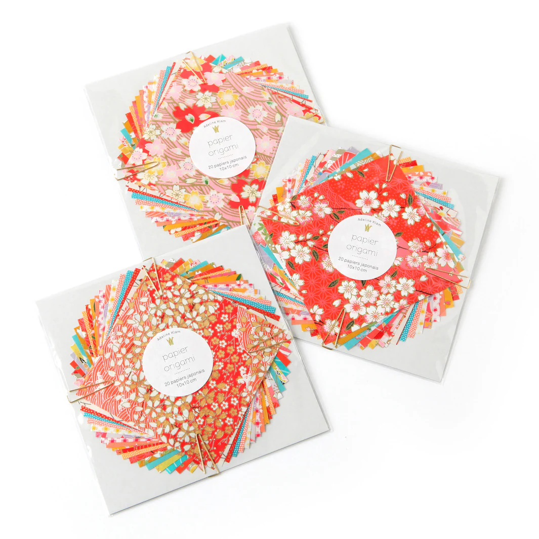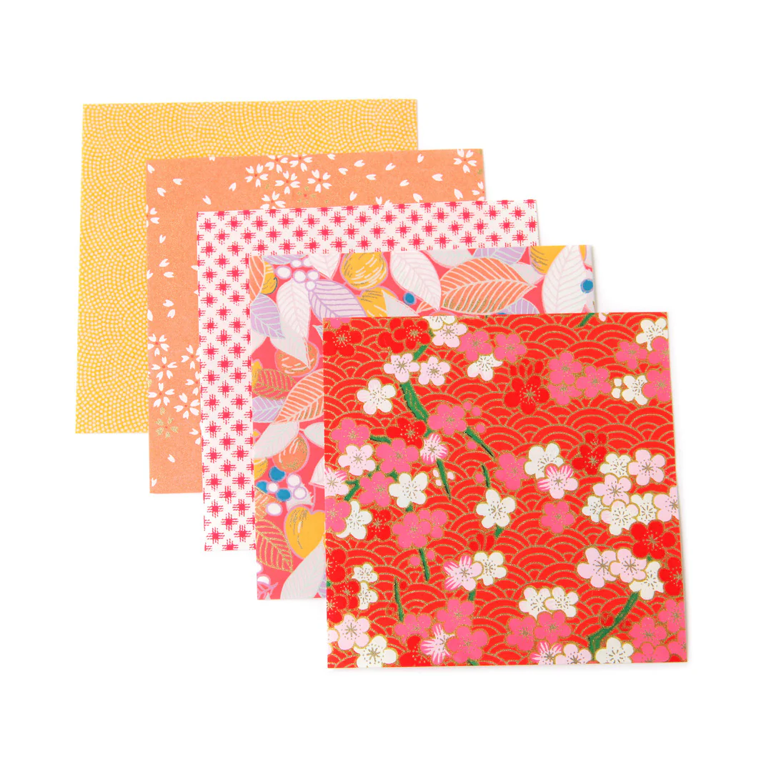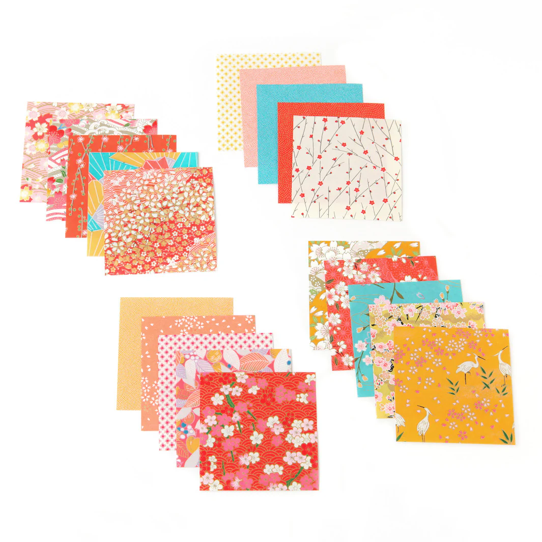 Ce joli set contient 20 carrés de papiers japonais (washi, yuzen, chiyogami) pour l’origami de 10cm de côté, dans des tons chauds de jaunes, d’orange, de rouges, de roses et de bleus.