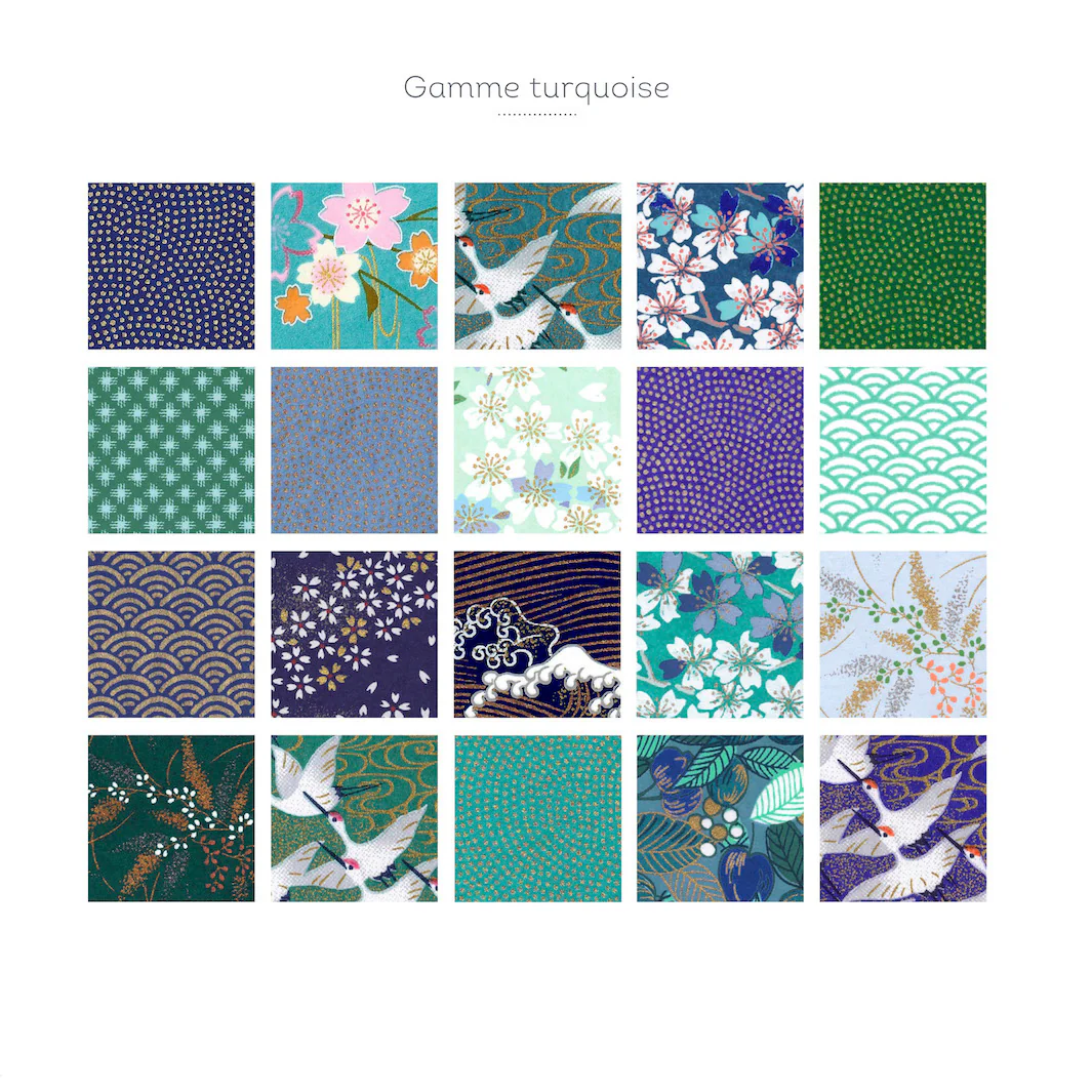 Ce joli set contient 20 carrés de papiers japonais (washi, yuzen, chiyogami) pour l’origami de 10cm de côté, dans des tons froids de bleus, de bleu turquoise, de vert, de vert d’eau, de bleu nuit et de violets de la gamme Turquoise.