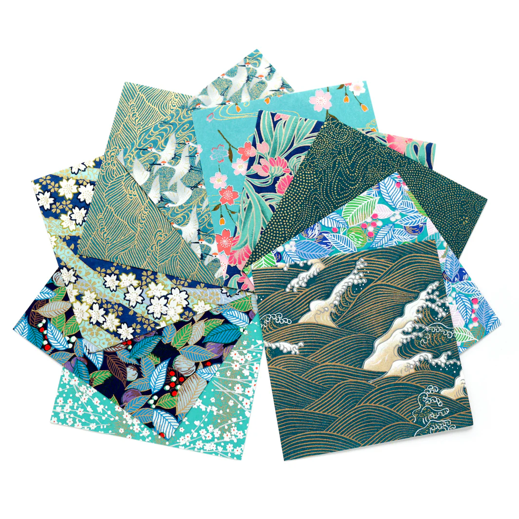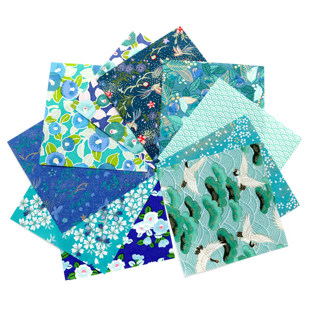 Ce joli set contient 20 carrés de papiers japonais (washi, yuzen, chiyogami) pour l’origami de 12cm de côté, dans des tons de bleus, de bleu turquoise, de vert, de vert d’eau, de bleu nuit et de violets de la gamme « Turquoise ».