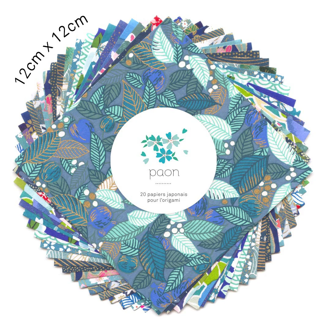 20 Papiers Origami – 12 x 12 cm – Bleu Canard, Vert d’Eau, Bleu Nuit, Turquoise et Violet – Paon