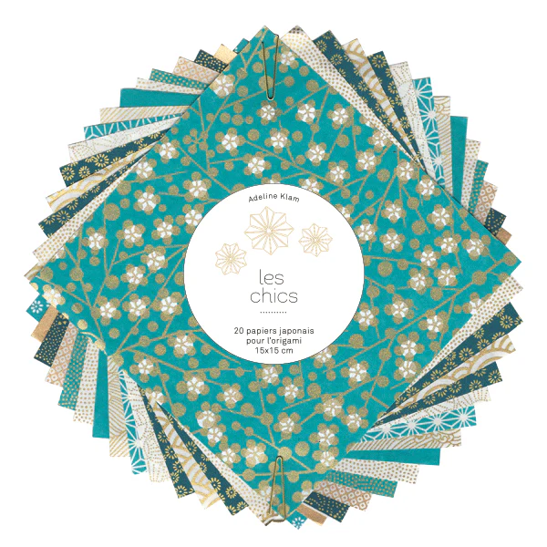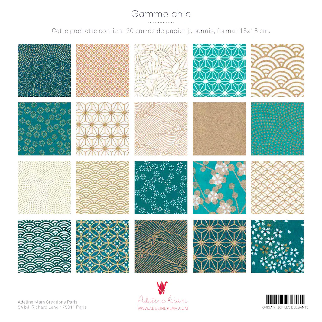 Ce joli set contient 20 carrés de papiers japonais washi, yuzen, chiyogami pour l’origami de 15cm de côté dans les tons dorés et bleu canard de la gamme « Les Chics », sélectionnés par Adeline !