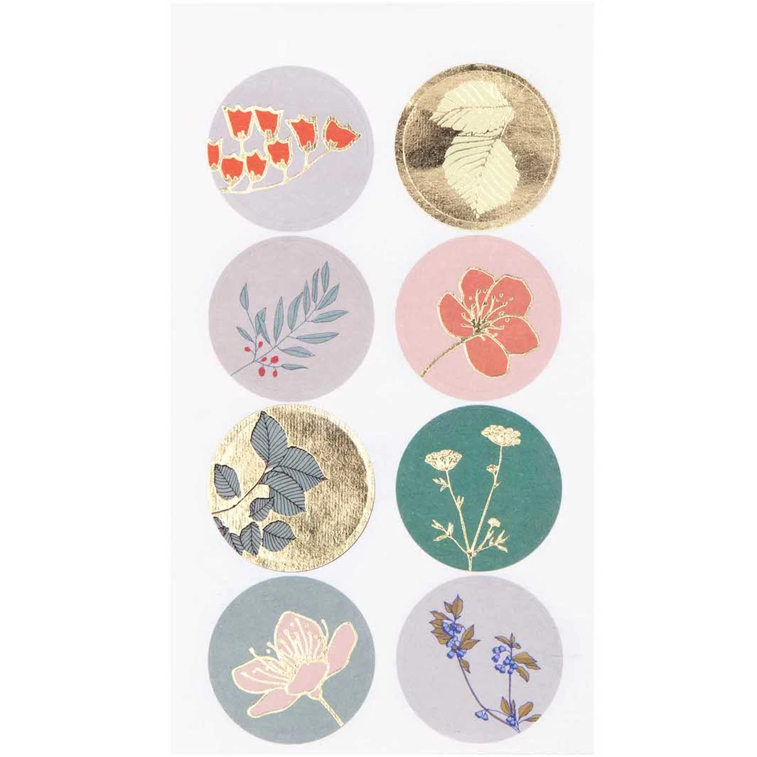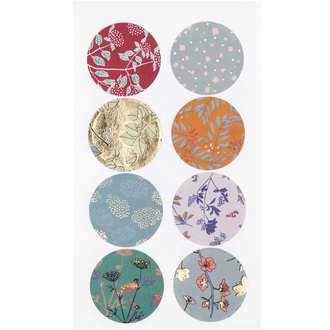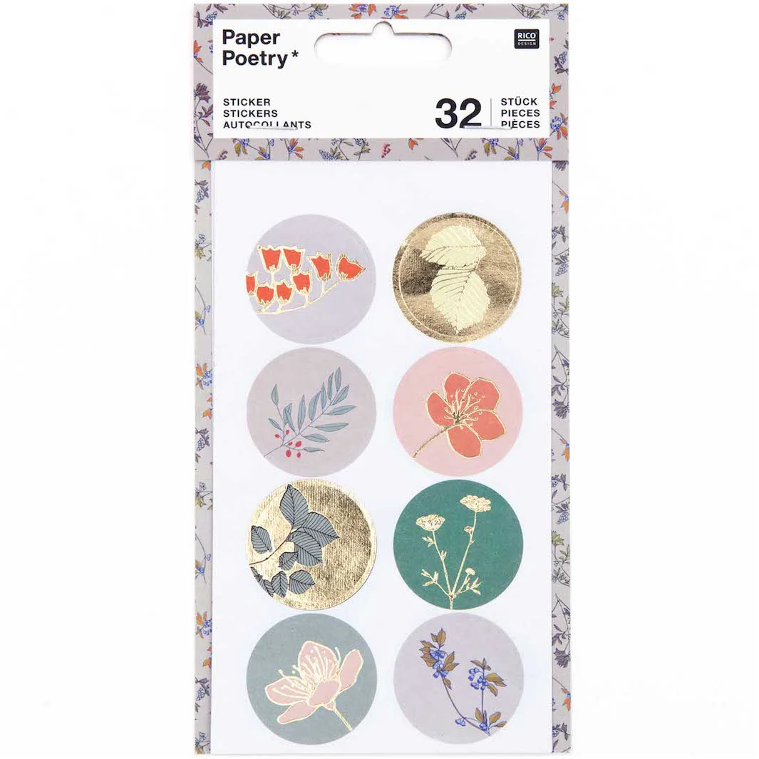 Jolies planches de 32 stickers aux motifs de fleurs d’automnes dans les tons crails, mauves claires, turquoises foncés et détails dorés de la marque allemande Rico Design.