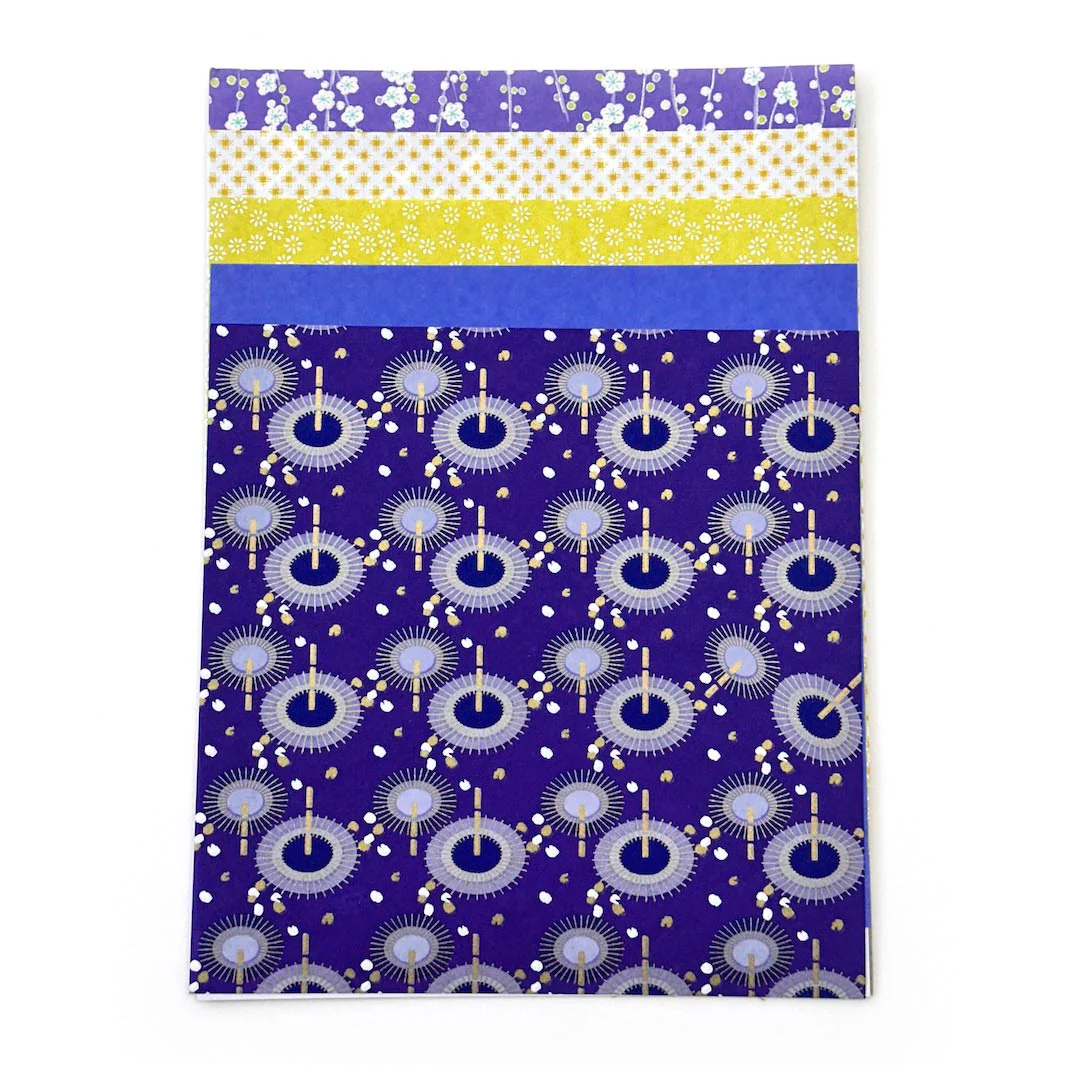 Ce joli set contient 5 carrés de papier japonais de 19,50 x 19,50cm pour l’origami dans les tons bleu nuit, violet et jaune acidulé, sélectionnés par Adeline !