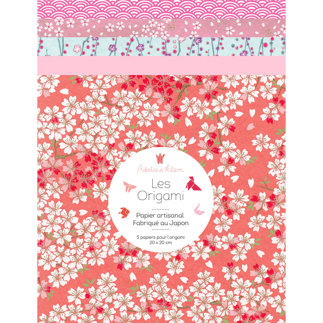 Ce joli set contient 5 carrés de papiers japonais washi, yuzen, chiyogami pour l’origami dans les tons roses, corail et bleu clair, sélectionnés par Adeline !