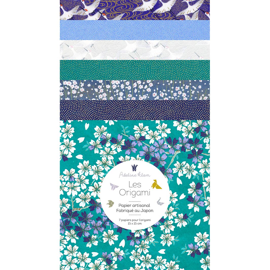 Ce joli set de 7 carrés de papiers japonais (washi, yuzen, chiyogami) pour l’origami de 15cm de côté, dans des tons bleu, vert d’eau, violet et blanc de la gamme « Aokakesu » (Z5) a été imaginé par Adeline.