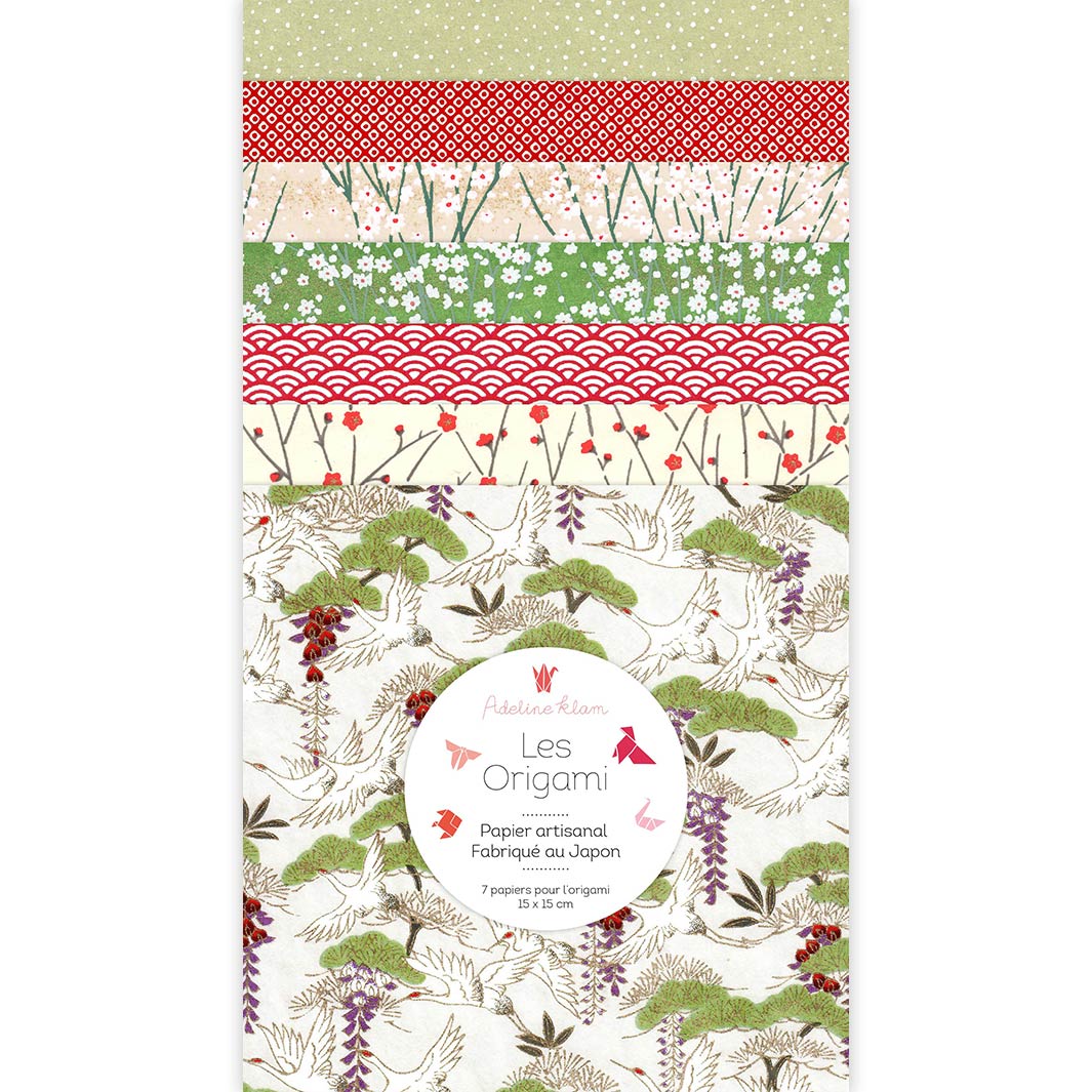 Ce joli set de 7 carrés de papiers japonais (washi, yuzen, chiyogami) pour l’origami de 15cm de côté, dans des tons de blanc, de beige, de vert et de rouge de la gamme « Roseaux » (I4) a été imaginé par Adeline.