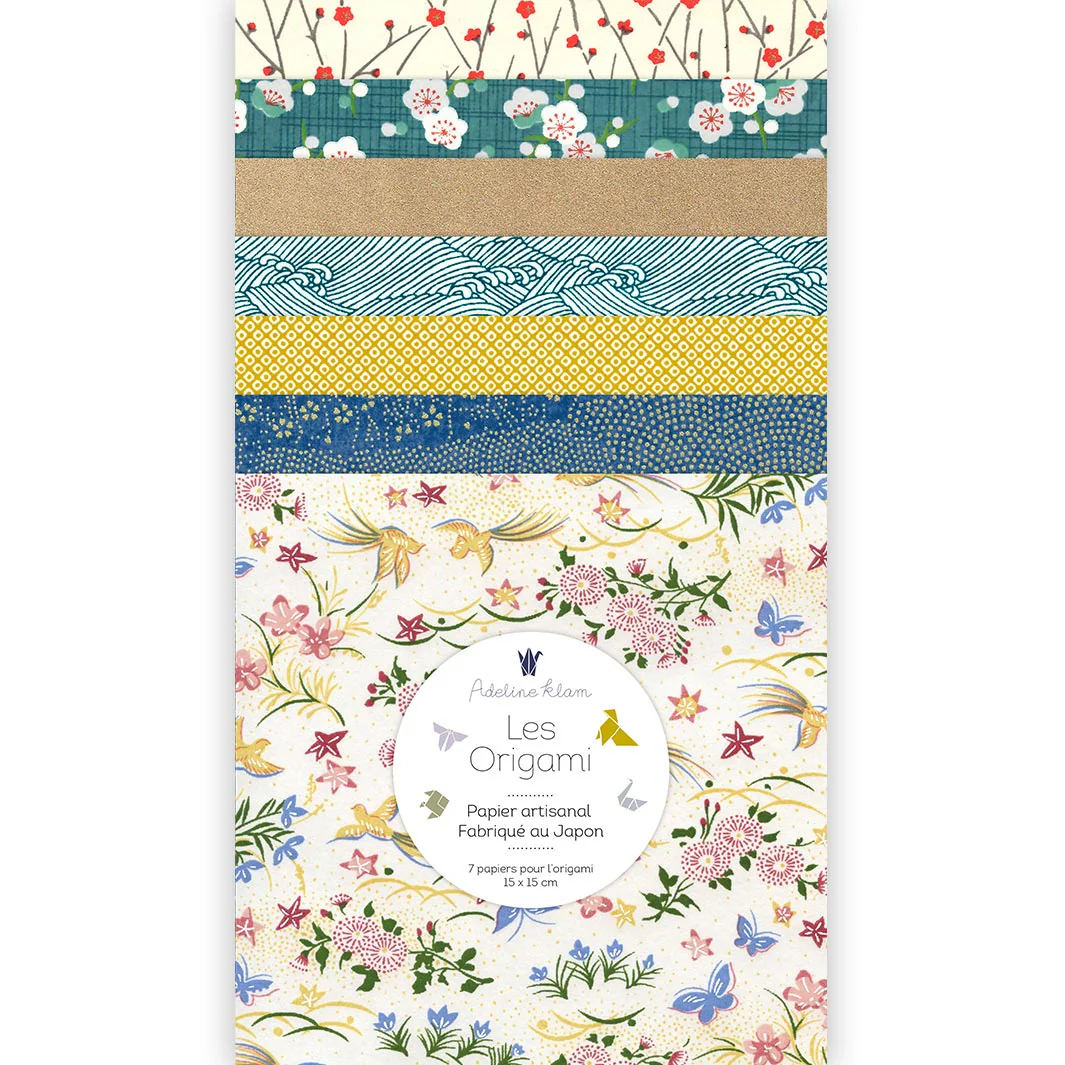 Ce joli set de 7 carrés de papiers japonais (washi, yuzen, chiyogami) pour l’origami de 15cm de côté, dans des tons bleu gris, jaune moutarde, crème et dorés de la gamme « Tea Time » (G5) a été imaginé par Adeline.