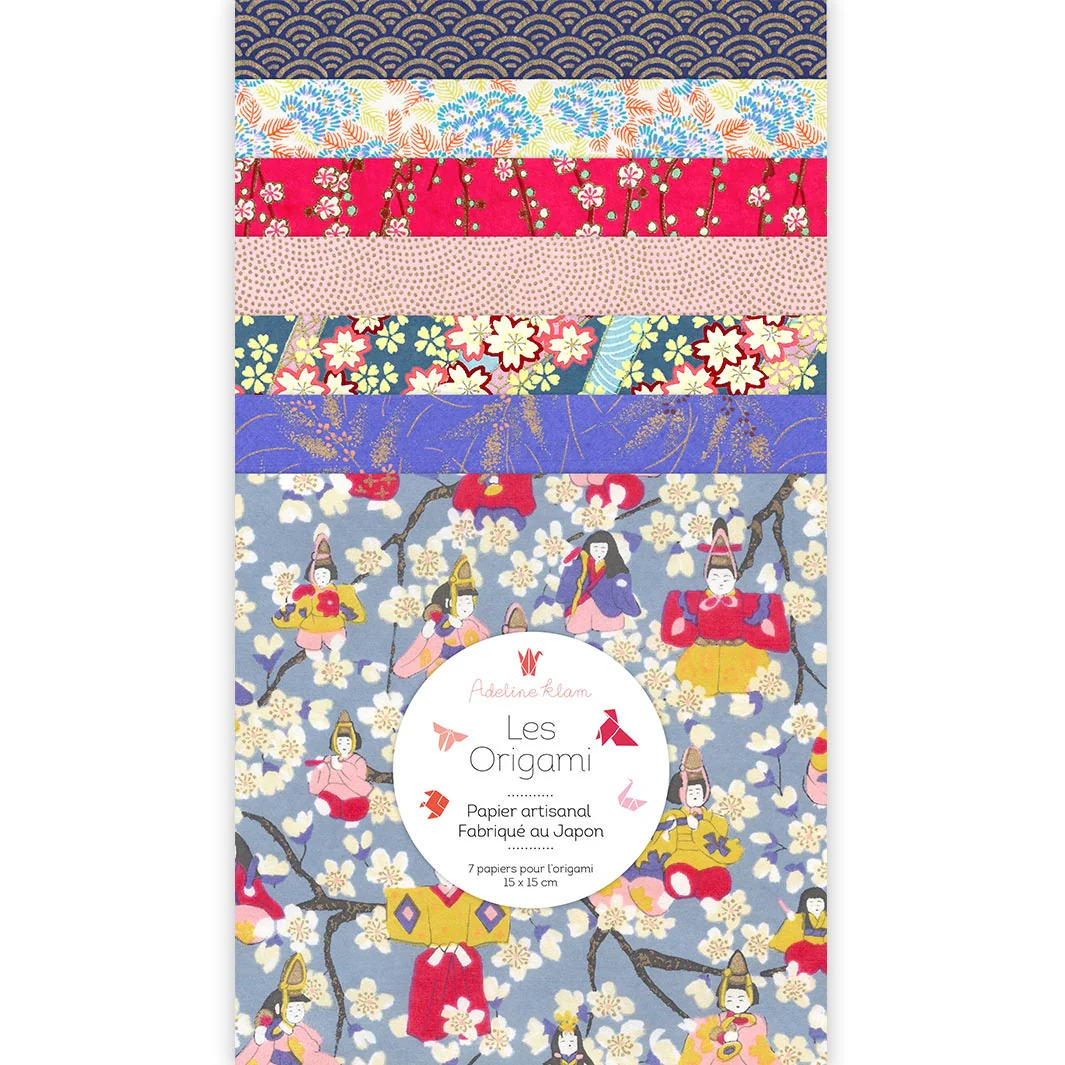 Cet adorable set de 7 carrés de papiers japonais (washi, yuzen, chiyogami) pour l’origami de 15cm de côté, dans des tons bleu nuit, rose clair et rose fuchsia, bleu moyen et jaune de la gamme « Myrtille » (T9) a été imaginé par Adeline.