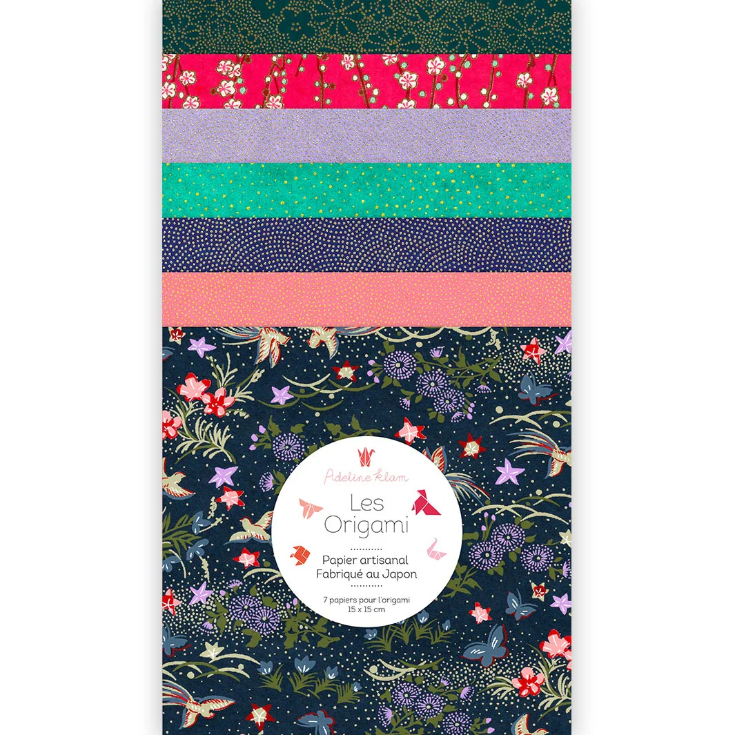 Ce joli set de 7 carrés de papiers japonais (washi, yuzen, chiyogami) pour l’origami de 15cm de côté, dans des tons bleu nuit, roses, violets et verts de la gamme « Gala » (Y4) a été imaginé par Adeline.