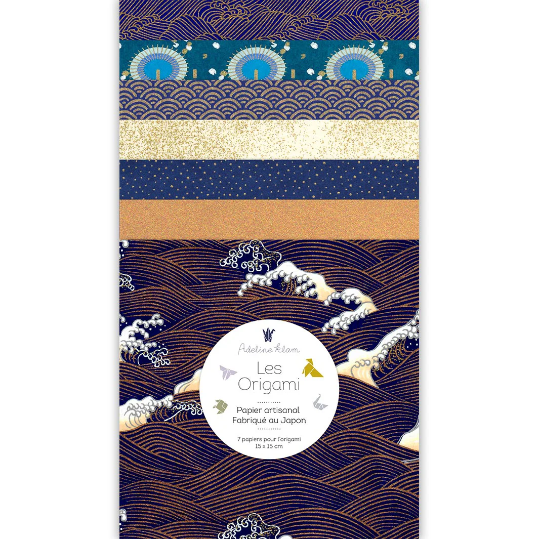 Cet adorable set de 7 carrés de papiers japonais (washi, yuzen, chiyogami) pour l’origami de 15cm de côté, dans des tons bleu nuit, bleu foncé, violets, blanc crème et dorés de la gamme « Hokusai » (X2) a été imaginé par Adeline.