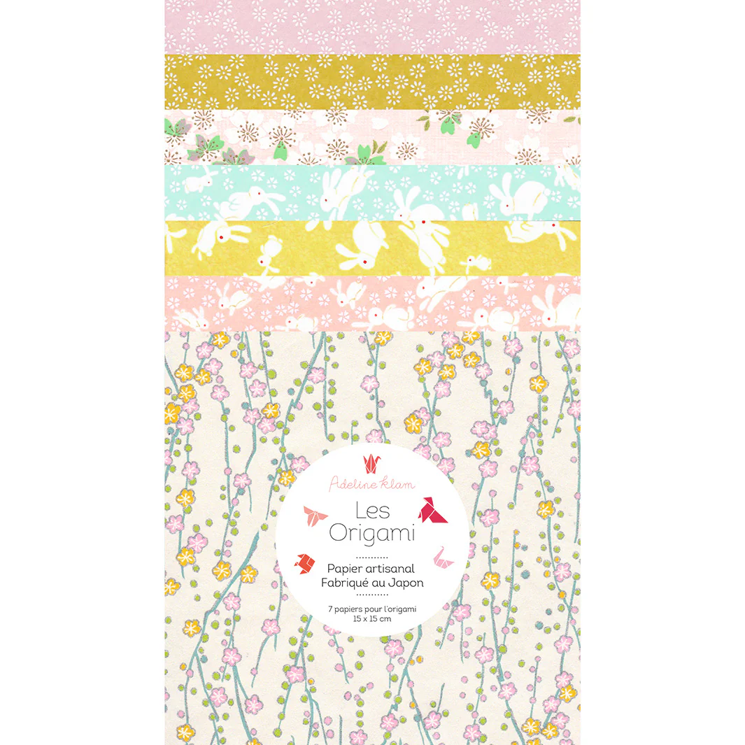 Ce joli set de 7 carrés de papiers japonais (washi, yuzen, chiyogami) pour l’origami de 15cm de côté, dans des tons de roses, rose pâle, jaune moutarde et vert d’eau de la gamme « Dragée » (C3) a été imaginé par Adeline.
