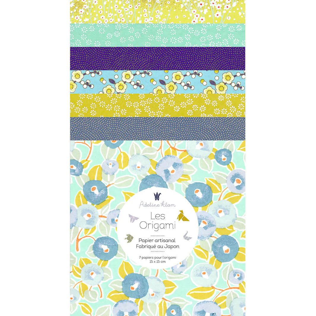 Ce joli set de 7 carrés de papiers japonais (washi, yuzen, chiyogami) pour l’origami de 15cm de côté, dans des tons jaunes, vert d’eau, bleu moyen et bleu pâle, de la gamme « Gai Pinson » (G4) a été imaginé par Adeline.