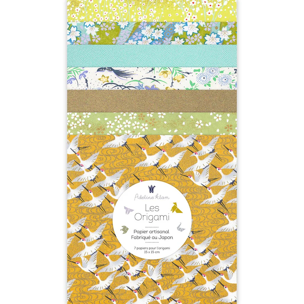 Ce joli set de 7 carrés de papiers japonais (washi, yuzen, chiyogami) pour l’origami de 15cm de côté, dans des tons jaune acidulé, jaune moutarde, vert d’eau, vert amande et dorés de la gamme « Champêtre » (I12) a été imaginé par Adeline.