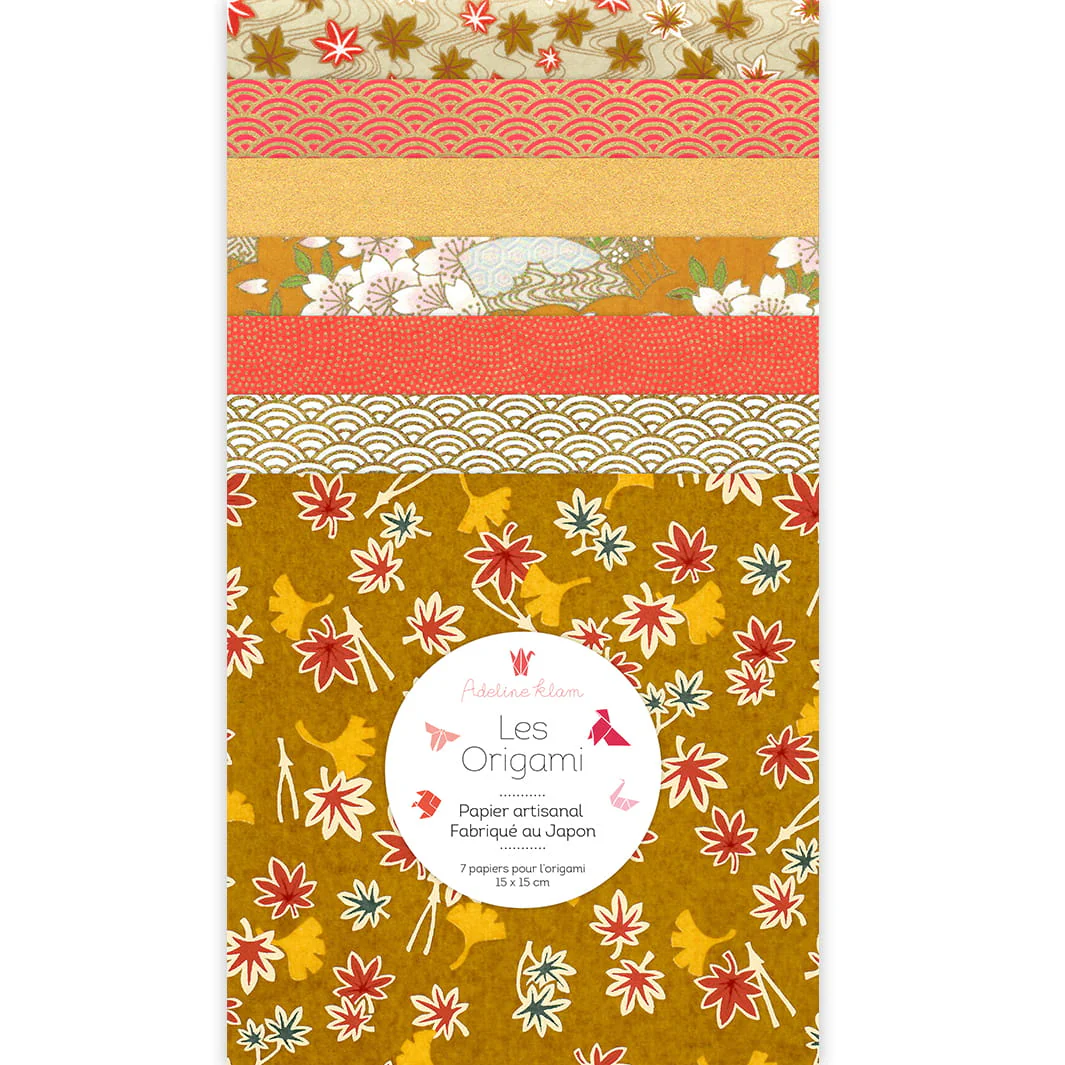 Ce joli set de 7 carrés de papiers japonais (washi, yuzen, chiyogami) pour l’origami de 15cm de côté, dans des tons jaune moutarde, rouge orange et dorés de la gamme « Automne » (A12) a été imaginé par Adeline.