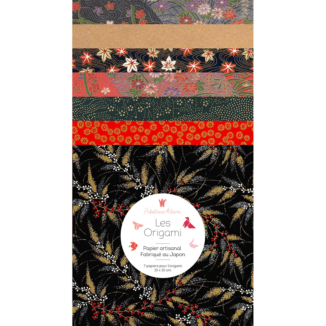 Joli set de 7 carrés de papiers japonais washi, yuzen, chiyogami pour l’origami dans différents tons de noirs, de rouges et de dorés.