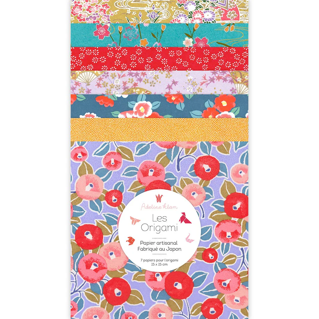 Ce joli set de 7 carrés de papiers japonais (washi, yuzen, chiyogami) pour l’origami de 15cm de côté, dans les tons violet lavande, bleu turquoise, jaune moutarde et rouge de la gamme « Carnaval » (T11) a été imaginé par Adeline.