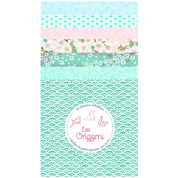 Ce joli set de 7 carrés de papiers japonais (washi, yuzen, chiyogami) pour l’origami de 15cm de côté, dans des tons vert menthe et rose pâle de la gamme « Menthe » (K) a été imaginé par Adeline.