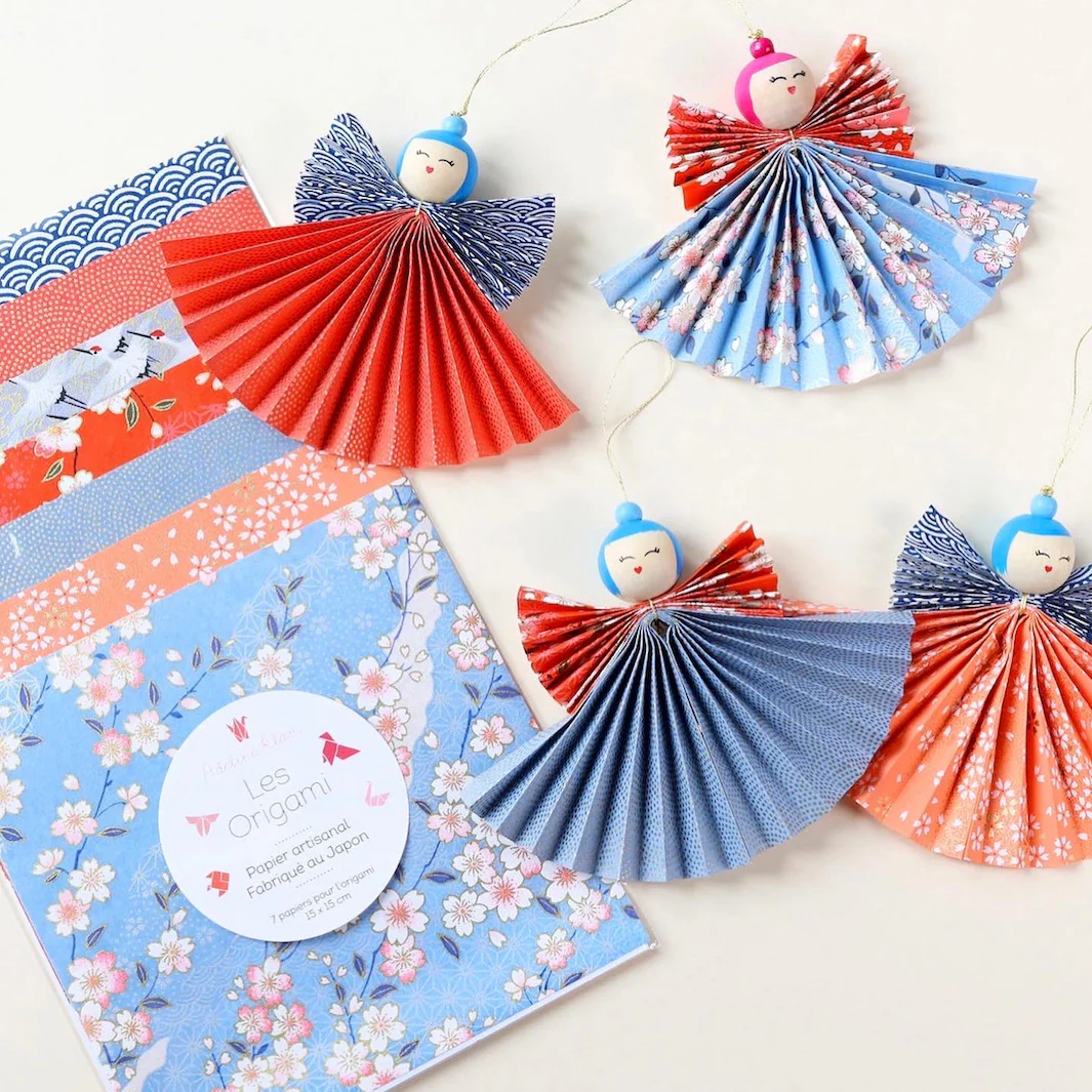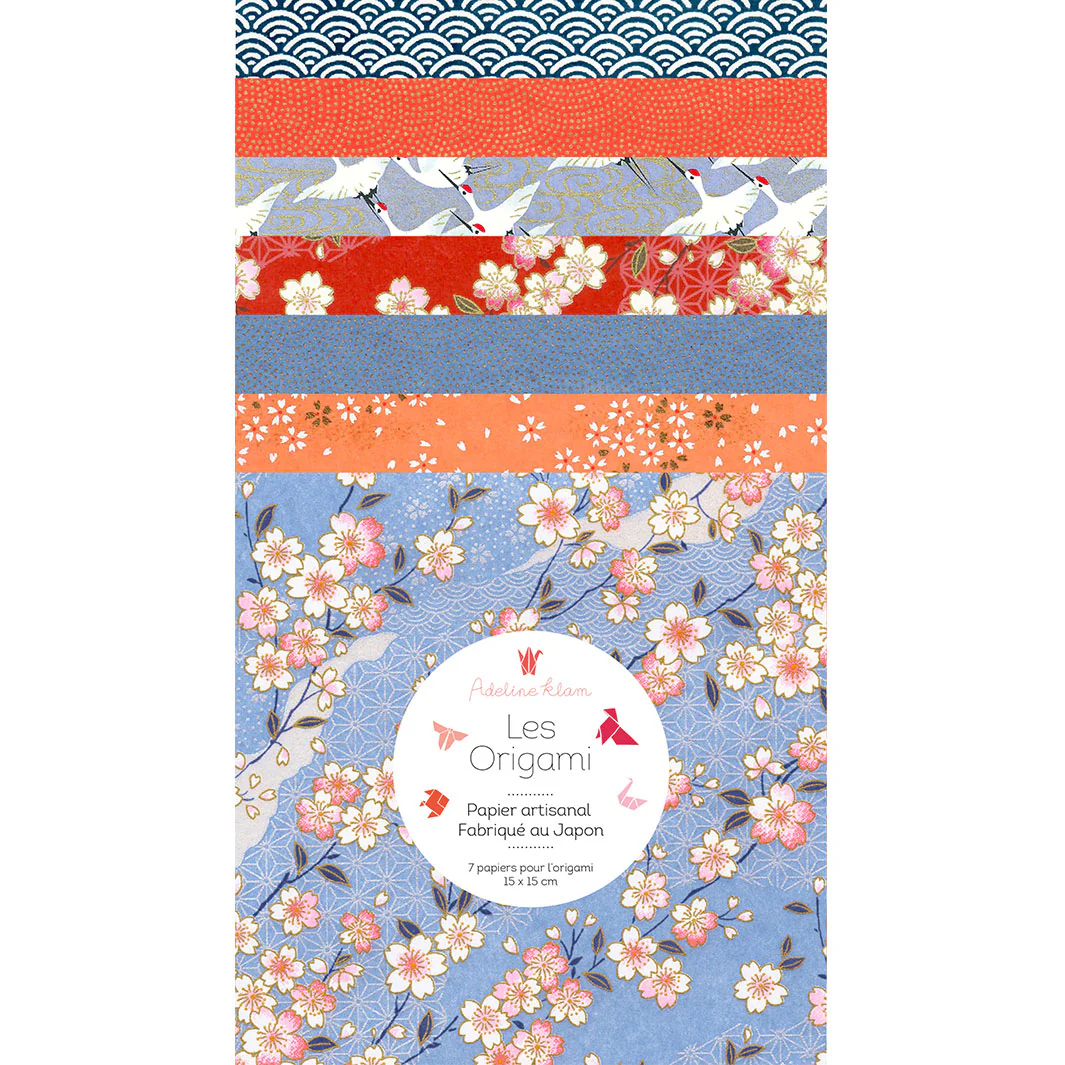 Ce joli set de 7 carrés de papiers japonais (washi, yuzen, chiyogami) pour l’origami de 15cm de côté, dans des tons bleu ciel, bleu gris, corail et rouge orangé de la gamme « Mont Kita » (T4) a été imaginé par Adeline.