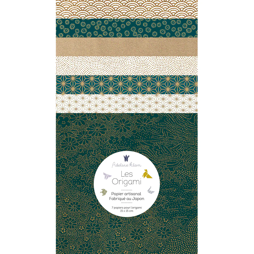 Ce joli set de 7 carrés de papiers japonais (washi, yuzen, chiyogami) pour l’origami de 15cm de côté, dans des tons de bleu canard et de dorés de la gamme « Paon » (E2) a été imagine par Adeline.