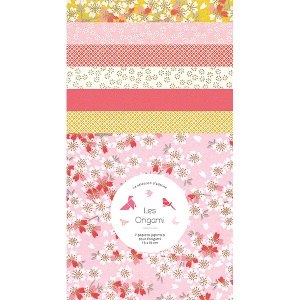 Ce joli set de 7 carrés de papiers japonais (washi, yuzen, chiyogami) pour l’origami de 15cm de côté, dans des tons rose pâle, moutarde, doré et jaune de la gamme « Pamplemousse » (L2) a été imaginé par Adeline.