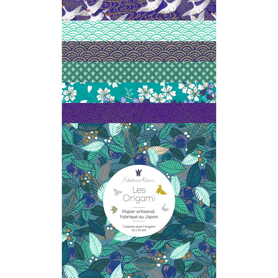 Ce joli set de 7 carrés de papiers japonais (washi, yuzen, chiyogami) pour l’origami de 15cm de côté, dans des tons bleu, vert d’eau, violet et blanc de la gamme « Paon » (Z4) a été imaginé par Adeline.