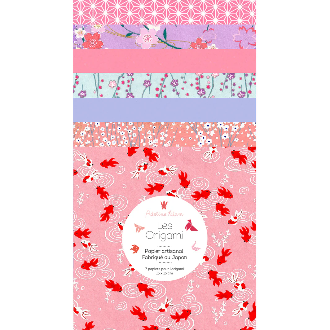 Ce joli set de 7 carrés de papiers japonais (washi, yuzen, chiyogami) pour l’origami de 15cm de côté, dans des tons roses et parme de la gamme « Praline » (C1) a été imagine par Adeline.