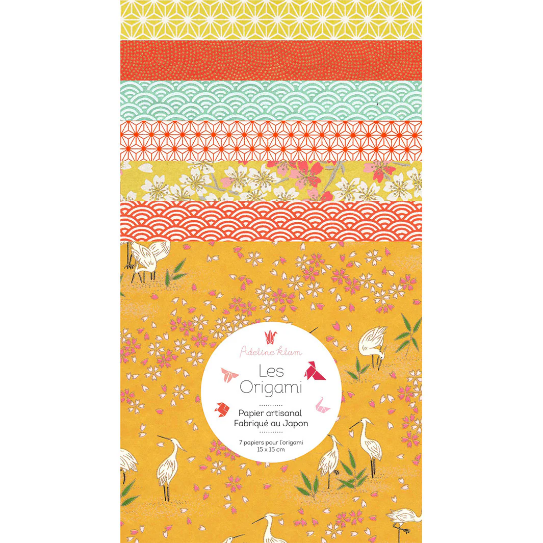 Ce joli set de 7 carrés de papiers japonais (washi, yuzen, chiyogami) pour l’origami de 15cm de côté, dans des tons rouges, orange, moutarde et vert d’eau de la gamme « Rizière » (A2) a été imaginé par Adeline.