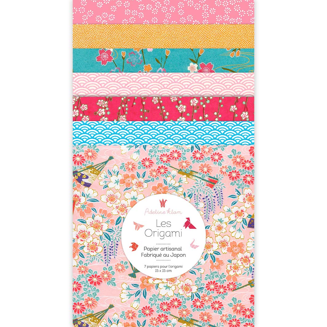 Ce joli set de 7 carrés de papiers japonais (washi, yuzen, chiyogami) pour l’origami de 15cm de côté, dans des tons roses, de jaune orangé et de bleu turquoise de la gamme « Roudoudou » (A11) a été imaginé par Adeline.