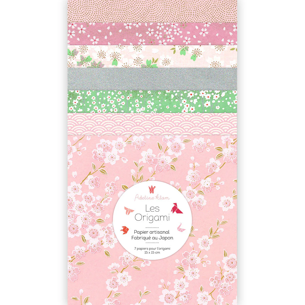 Ce joli set de 7 carrés de papiers japonais (washi, yuzen, chiyogami) pour l’origami de 15cm de côté, dans des tons roses, verts et argentés de la gamme « Dragée » (C5) a été imaginé par Adeline.