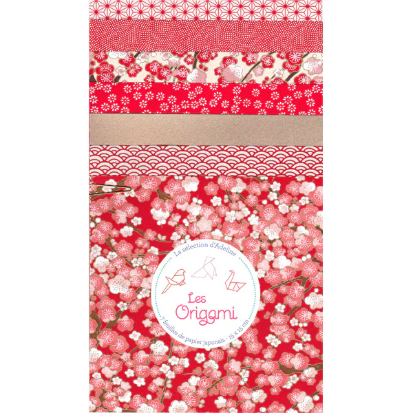 Ce joli set de 7 carrés de papiers japonais (washi, yuzen, chiyogami) pour l’origami de 15cm de côté, dans des tons rouges, roses, or et blancs de la gamme « Rouge et Or » (J) a été imaginé par Adeline.
