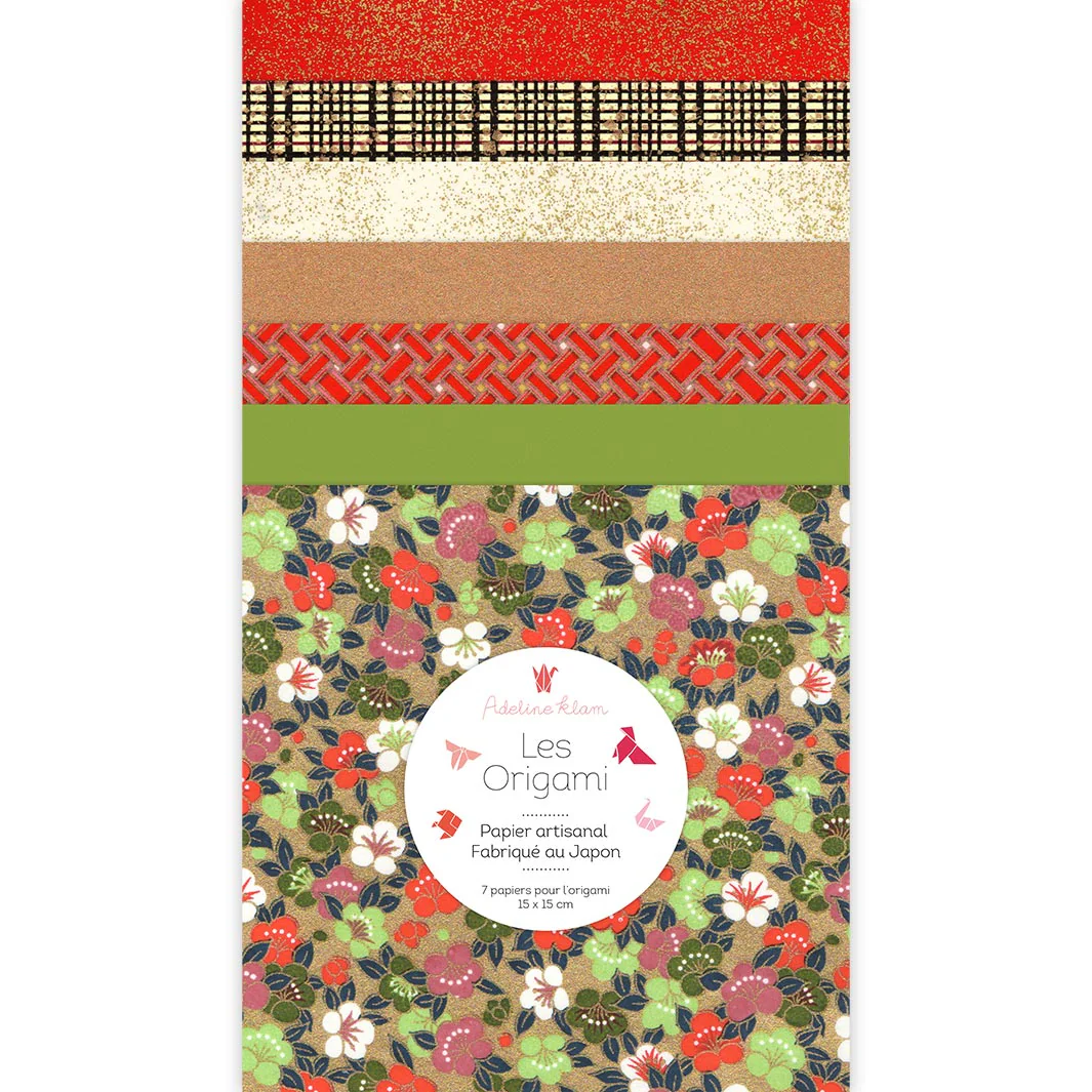 Ce joli set de 7 carrés de papiers japonais (washi, yuzen, chiyogami) pour l’origami de 15cm de côté, dans des tons rouge, vert clair, dorés et noirs de la gamme « Rétro » (N7) a été imaginé par Adeline.