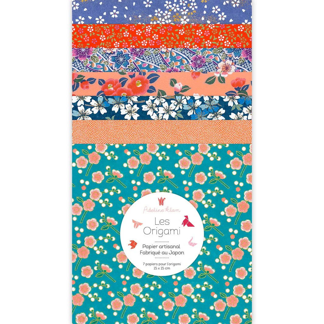 Ce joli set de 7 carrés de papiers japonais (washi, yuzen, chiyogami) pour l’origami de 15cm de côté, dans des tons bleu moyen, rouge orange, corail et turquoise de la gamme « Colette » (T10) a été imaginé par Adeline.
