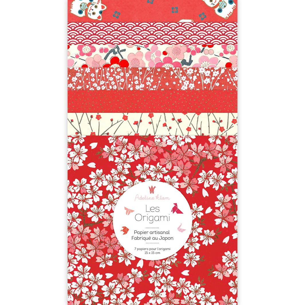 Ce joli set de 7 carrés de papiers japonais (washi, yuzen, chiyogami) pour l’origami de 15cm de côté, dans des tons variés de rouges, de roses et de crème de la gamme « Amour » (C2) a été imaginé par Adeline.