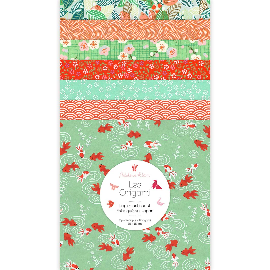 Ce joli set de 7 carrés de papiers japonais (washi, yuzen, chiyogami) pour l’origami de 15cm de côté, dans des tons de vert clair, de vert d’eau, d’orange, de saumon et de rouge orangé de la gamme « Verveine Pêche » (K4) a été imaginé par Adeline.