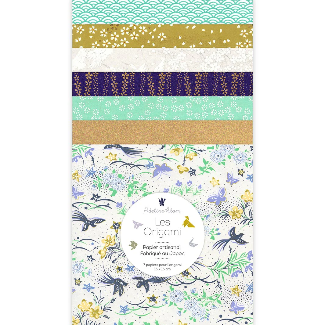 Ce joli set de 7 carrés de papiers japonais (washi, yuzen, chiyogami) pour l’origami de 15cm de côté, dans des tons de vert d’eau, de jaune moutarde, de blanc cassé et de bleu nuit de la gamme « Réglisse » (Z12) a été imaginé par Adeline.