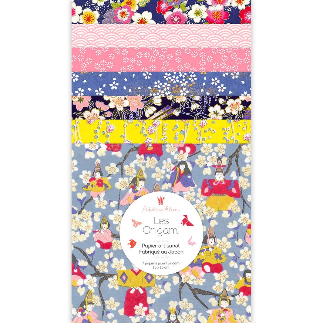 Ce joli set de 7 carrés de papiers japonais (washi, yuzen, chiyogami) pour l’origami de 15cm de côté, dans des tons violet foncé, rose clair et moyen, bleu pervenche, bleu gris et jaune de la gamme « Lily » (Y6) a été imaginé par Adeline.