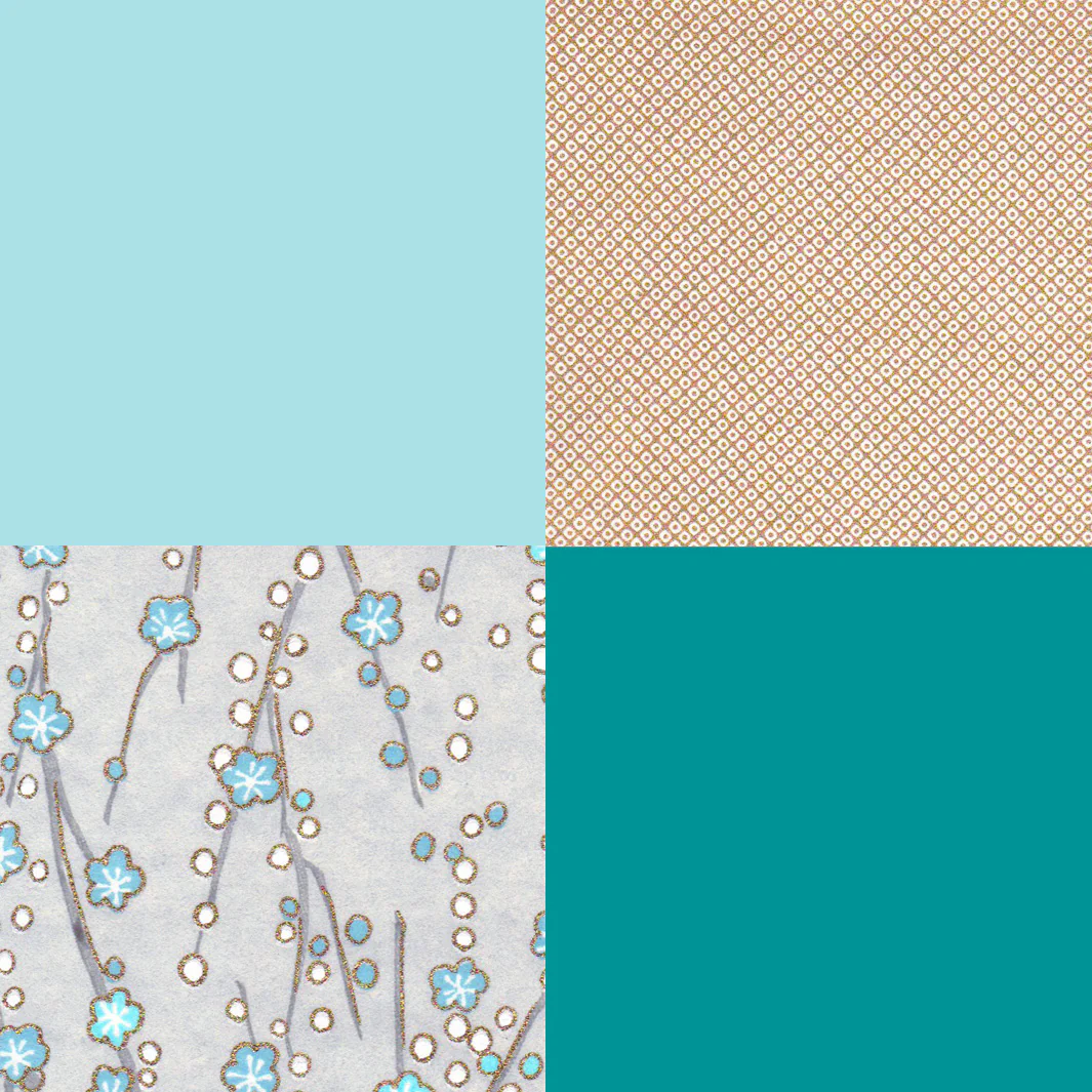 Joli set de 80 carrés de papiers japonais washi, yuzen, chiyogami pour l’origami dans les tons bleu clair, dorés, bleu canard et gris.