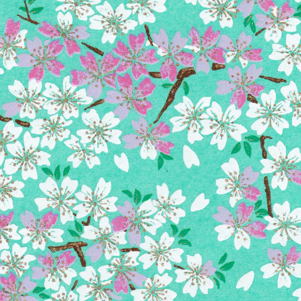 Fleurs de cerisier (sakura) blanches au détails roses et mauves, pistils dorés, branches marrons foncées, feuilles vertes et détails dorés sur fond vert menthe