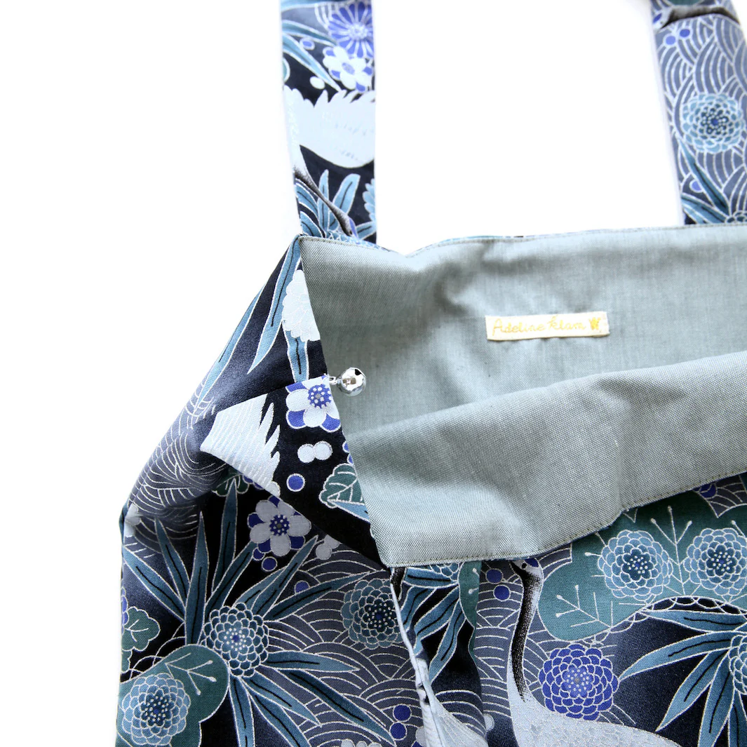 Joli cabas en tissus japonais, aux motifs traditionnels de grues (tsuru), de chrysanthèmes (kiku), de pins japonais (matsu), de feuilles de bambou (take) et de fleurs de prunier (ume) dans les tons gris, bleus marine, bleus pétrole, bleus indigo et vert foncé sur fond bleu marine très foncé (tissu extérieur) et uni gris bleuté (tissu intérieur).