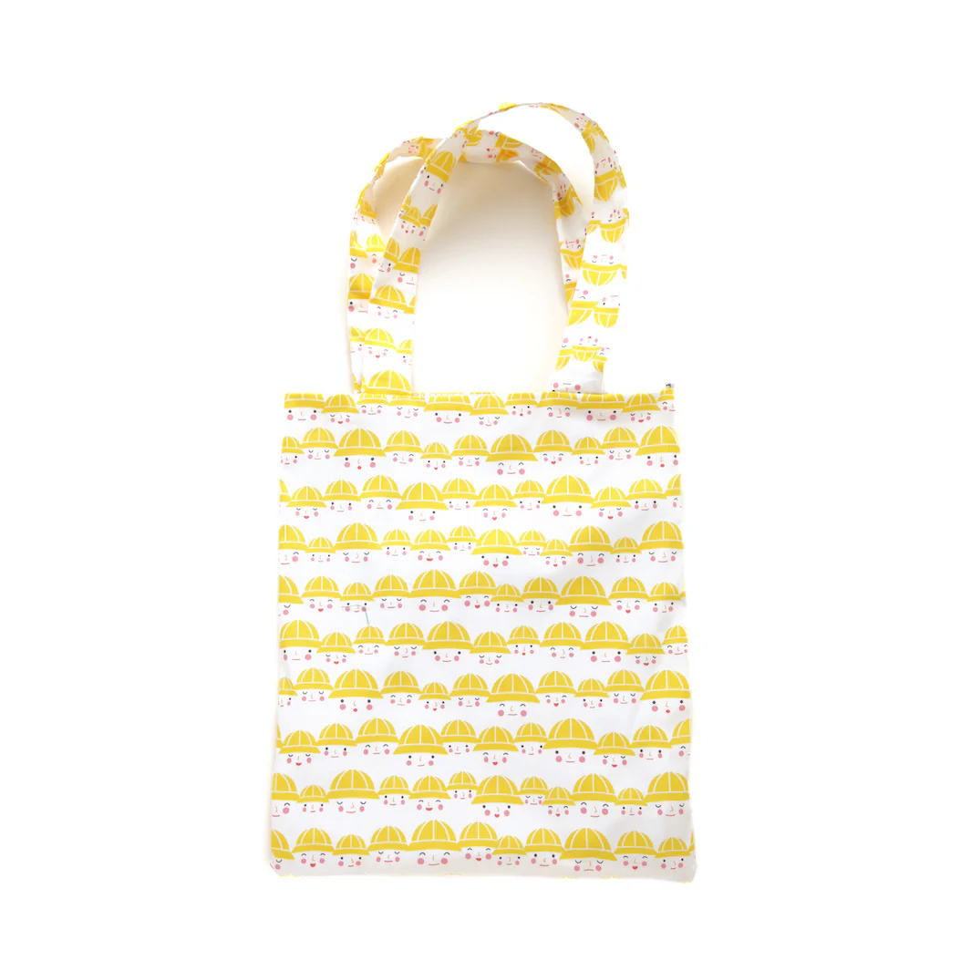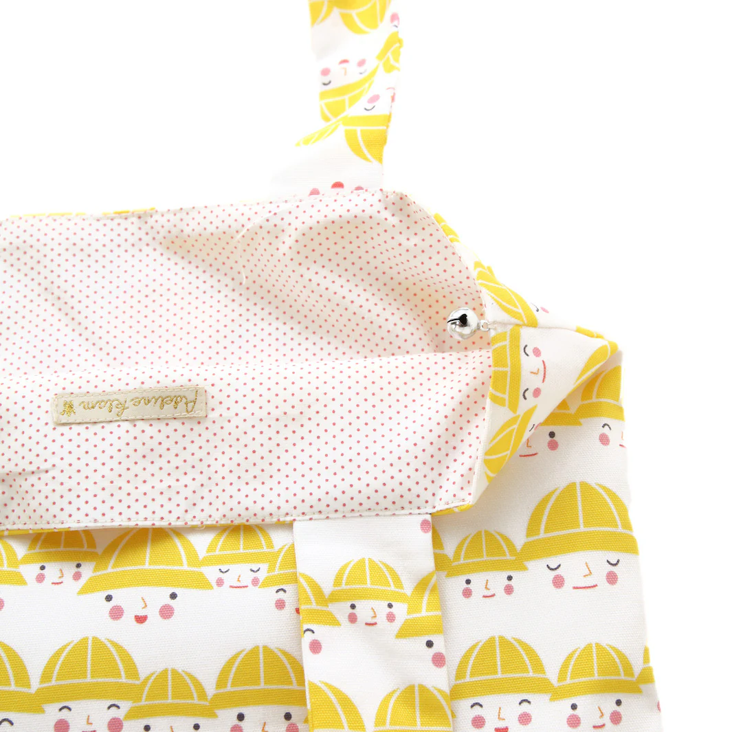 Joli cabas en tissus japonais aux motifs de petits écoliers japonais aux chapeaux jaunes et visages souriants (tissu extérieur) et petits pois roses sur fond blanc (tissu intérieur) et gros grelot argenté.