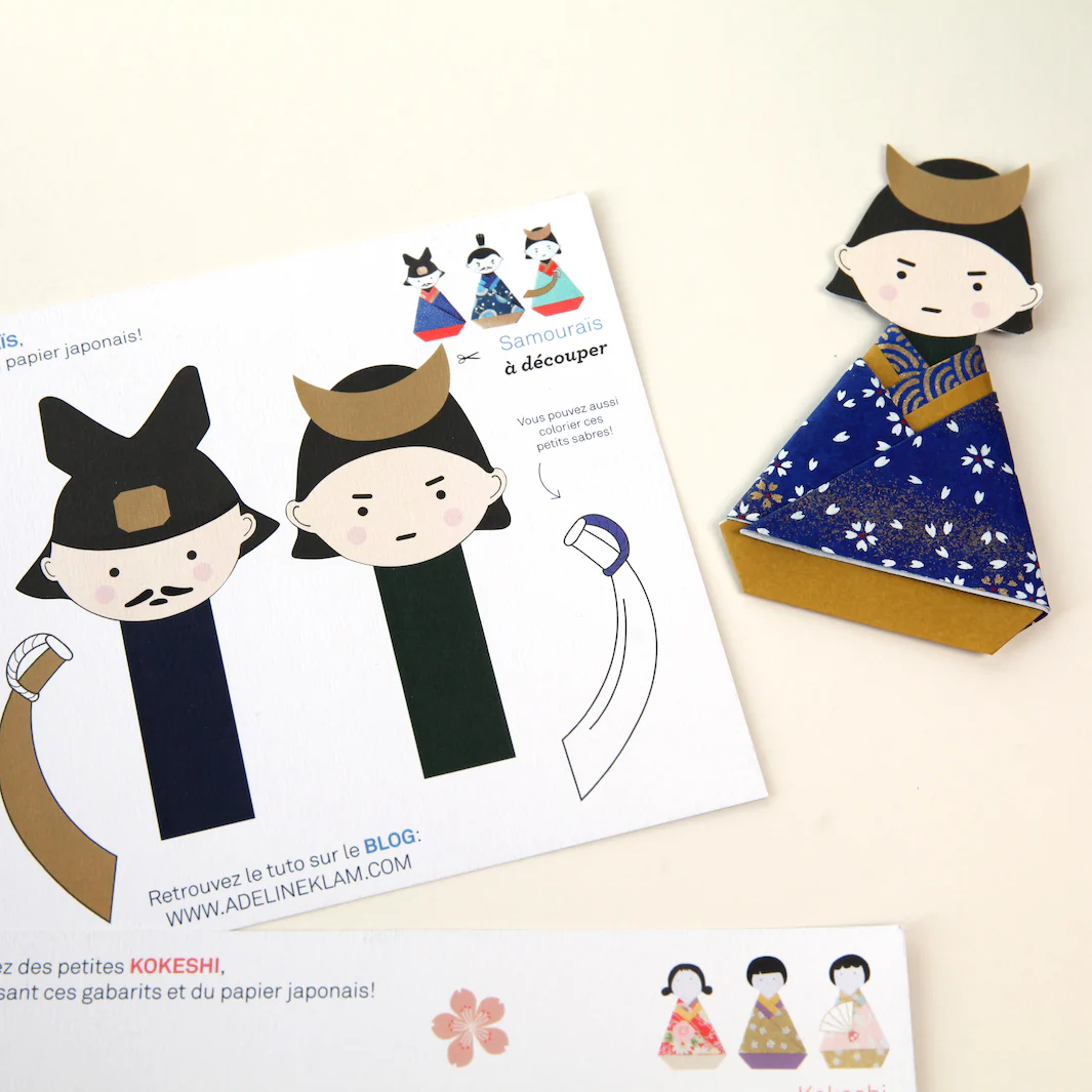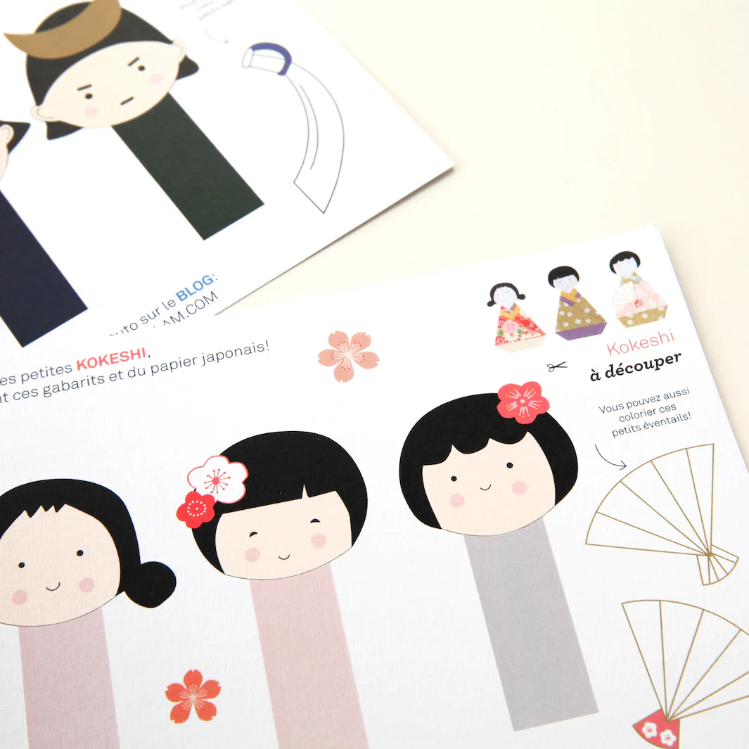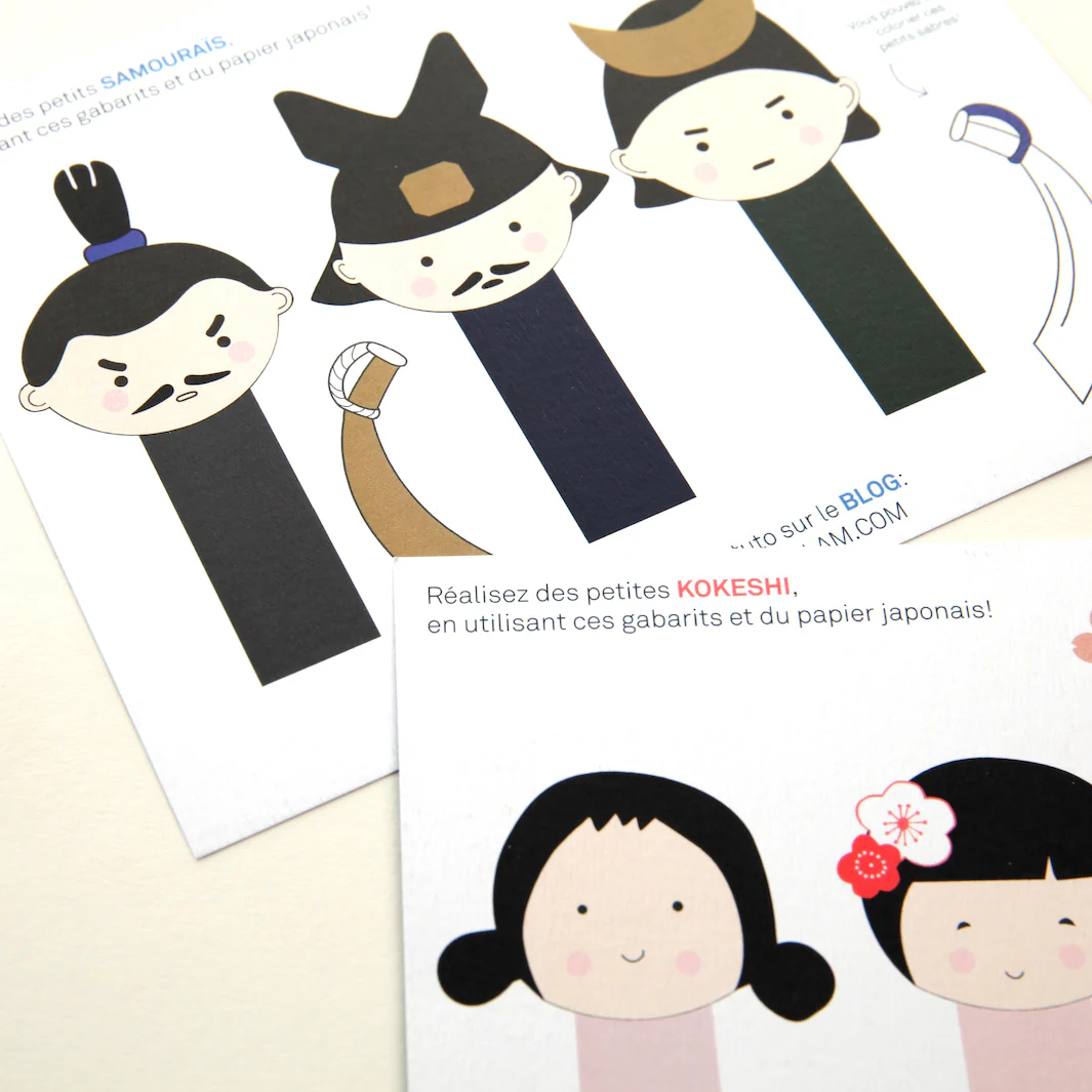 Adorables cartes, imprimées de 3 silhouettes de kokeshi et 3 silhouettes de samouraï à découper pour réaliser de jolies petites poupées habillées de papiers japonais.