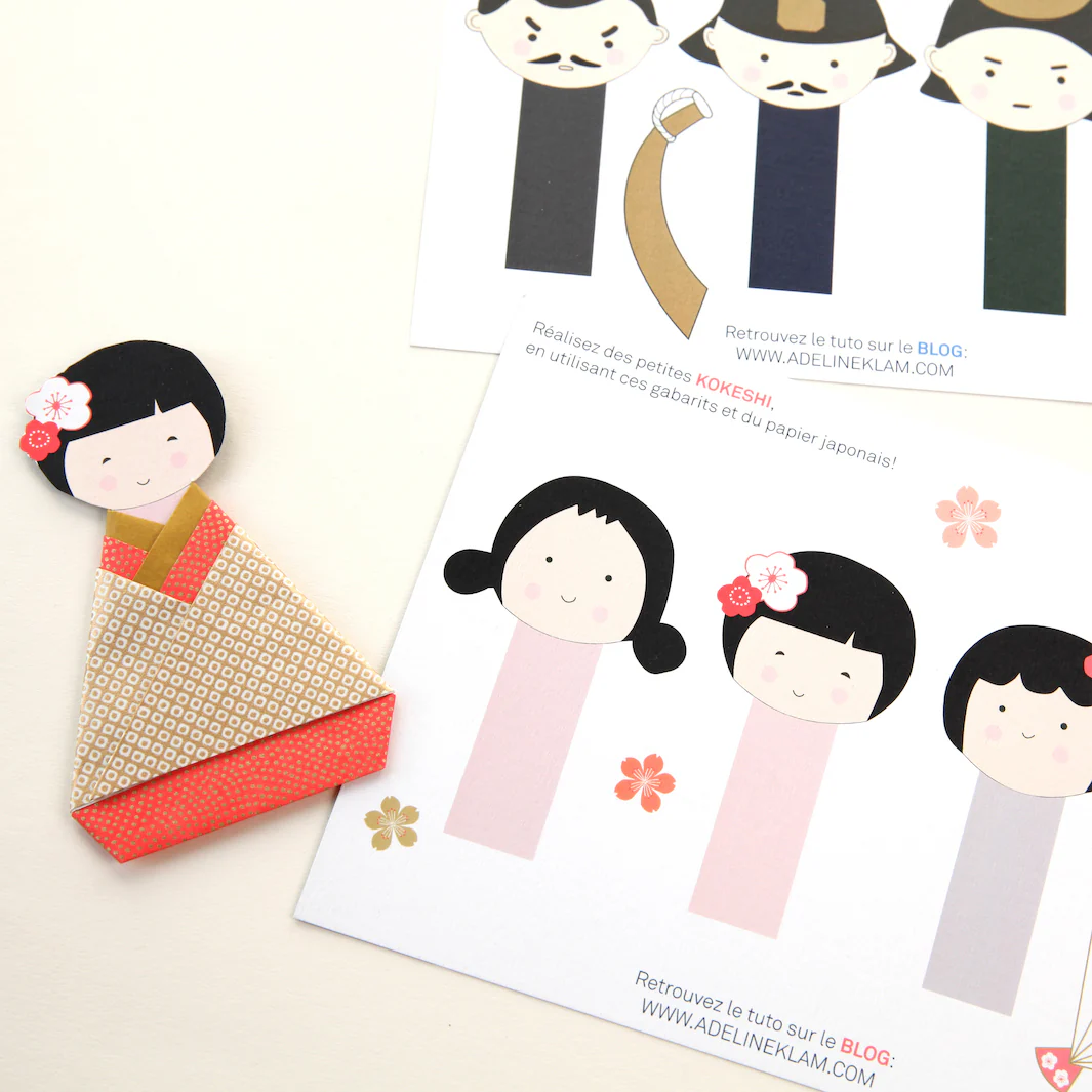 Le tutoriel du pliage des kimonos n’est pas fourni avec les silhouettes des poupées. Retrouvez le pas-à-pas sur le blog dans notre article « DIY Hina Matsuri, la fête des petites filles »