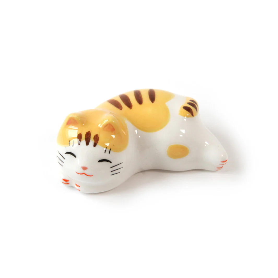 Cet adorable porte-baguettes en céramique est en forme de chat allongé, au pelage tigré jaune et marron !