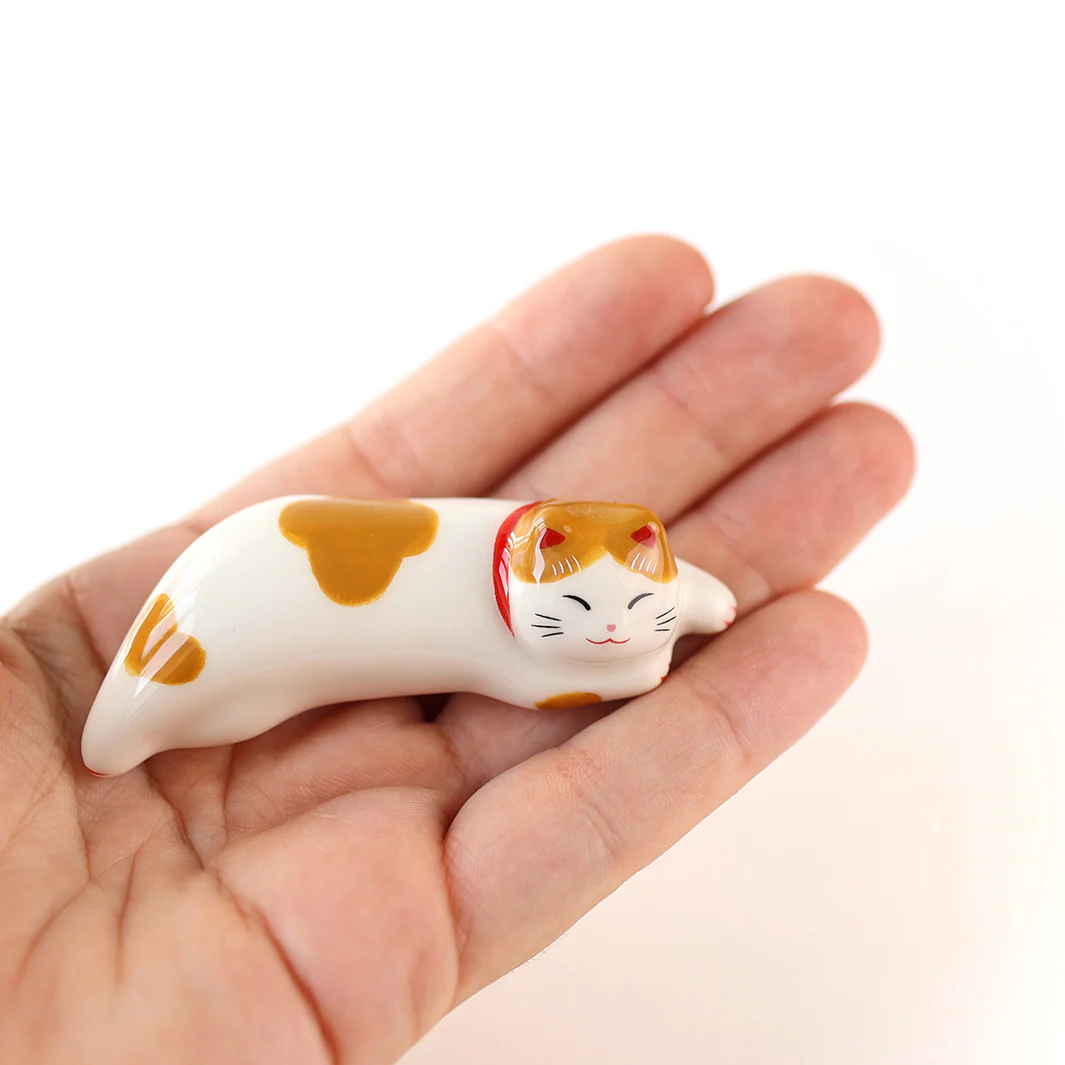 Cet adorable porte-baguettes en céramique est en forme de long chat allongé sur le ventre, au pelage moucheté roux et blanc !
