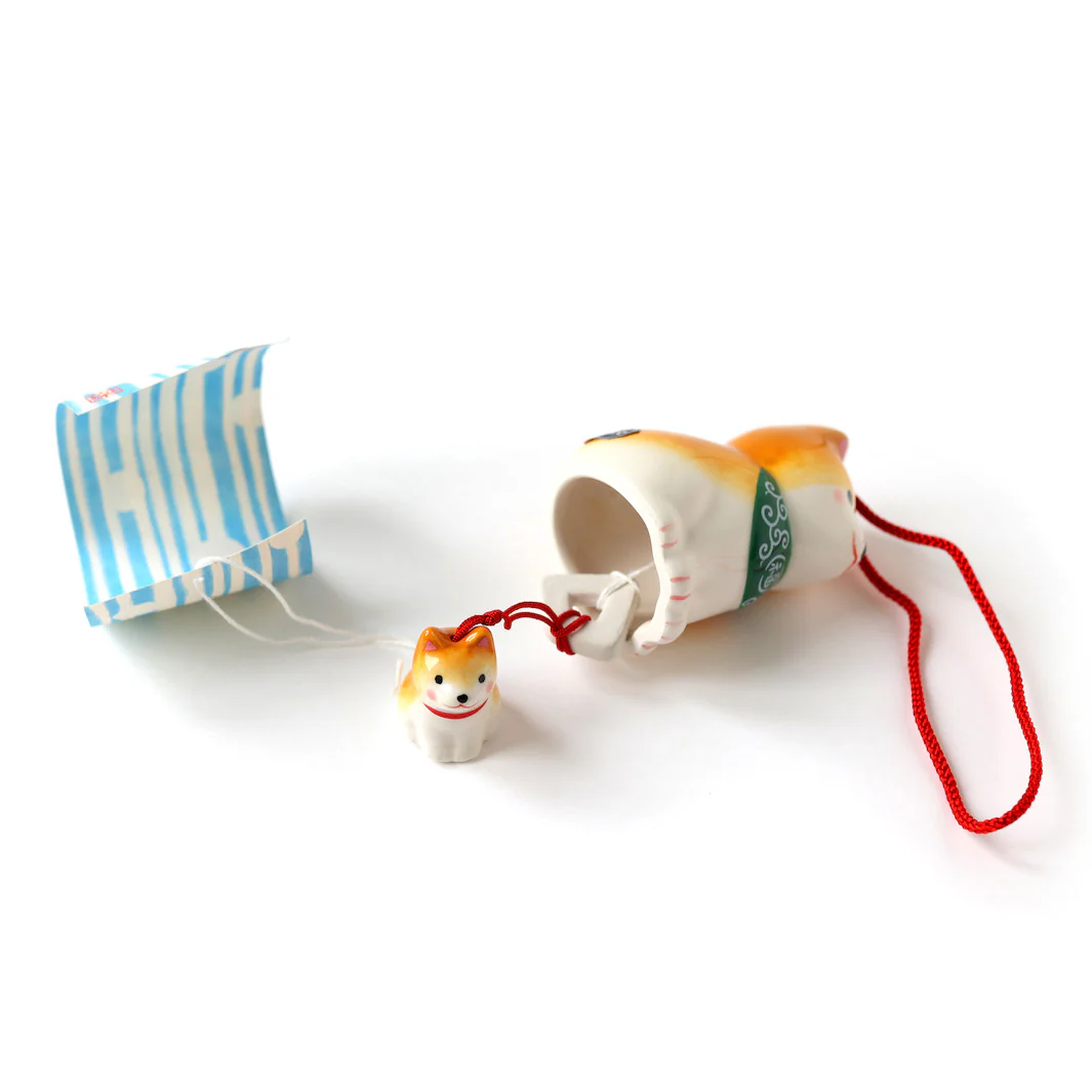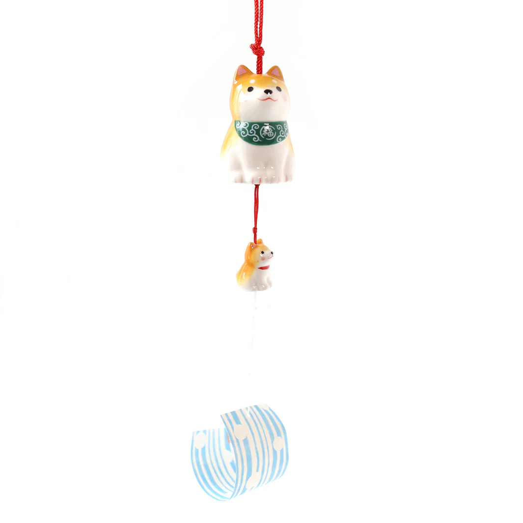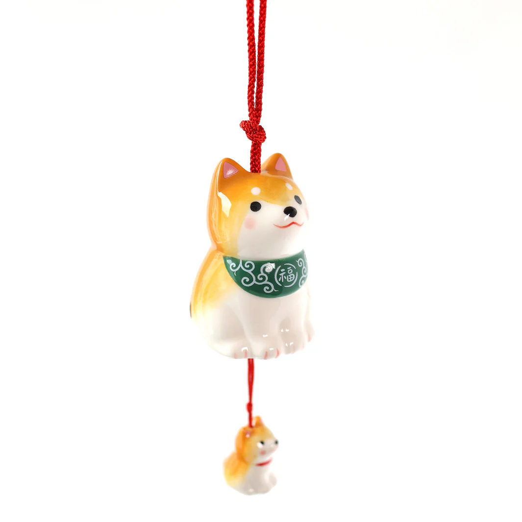 Clochette à Vent Japonaise en Céramique – Shiba Inu – Orange et Vert